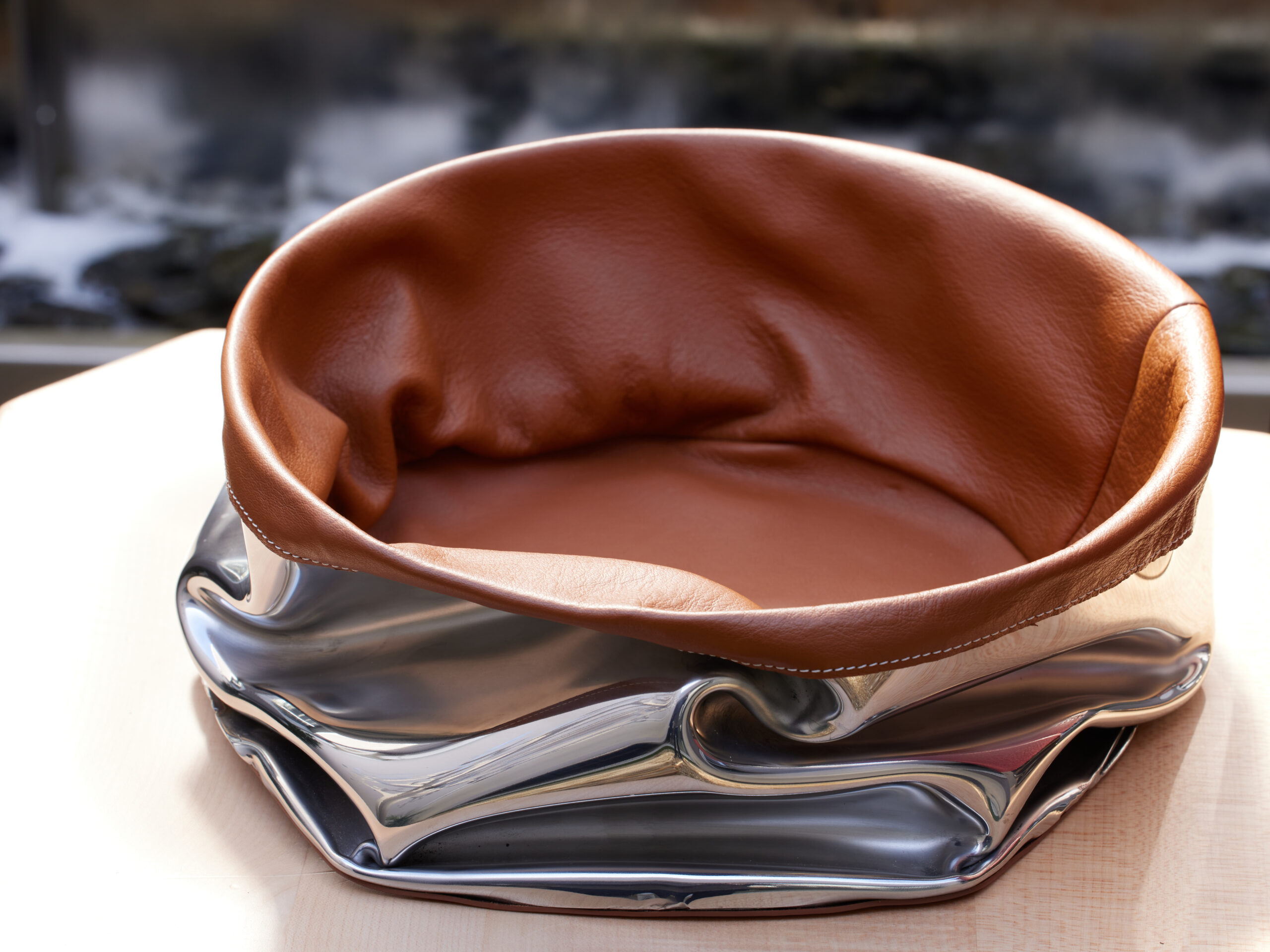 - Matériaux : inox poli miroir, cuir pleine fleur